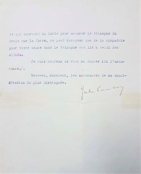 פריט מ"אסופת המאה": מכתב ממשרד החוץ הצרפתי, המביע