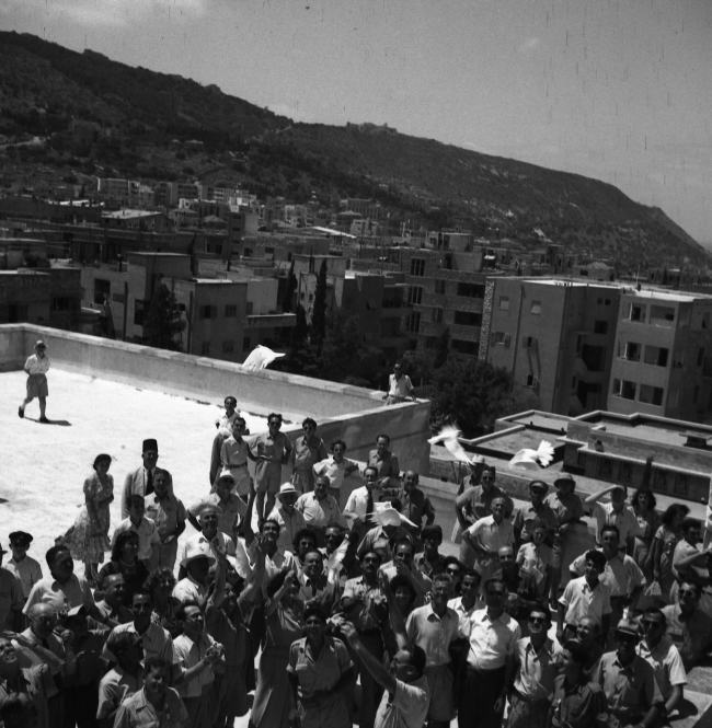 תושבי חיפה משלחים יונים מגג העירייה בזמן שארבעה מטוסי קרב, המלווים את מטוס אל-על ובו ארונו של הרצל, חולפים בשמים. (NKH\452142)