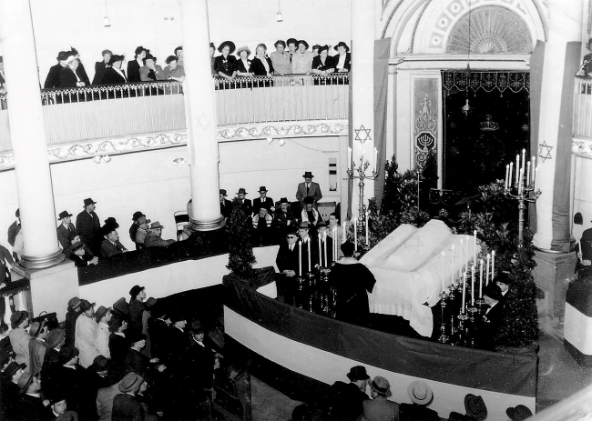 ארונו של הרצל הוצב בבית הכנסת הגדול של וינה מול ארון הקודש, שנעטף בדגלי מדינת ישראל. כשארונות הוריו משני צדדיו, וארון אחותו למרגלותיו, עברו אלפי יהודים ובהם ניצולי שואה על פני הארונות בסיומו של הטקס הדתי, שנערך בבית הכנסת היחיד בווינה, ששרד במלחמת העולם השנייה (PHG\1010556)