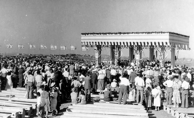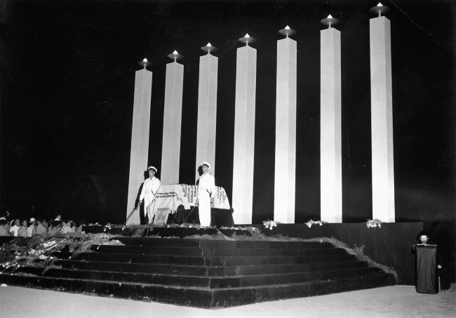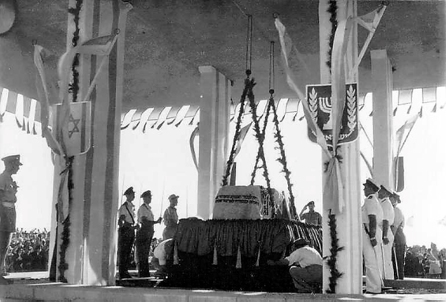 ארונו של הרצל מוצב ל-12 שעות על במה מוגבהת עם שבעה עמודים בכיכר הרברט סמואל, בקצה רחוב אלנבי בתל אביב. אלפים פוקדים את הקבר ביום ובלילה (PHG\1413996)