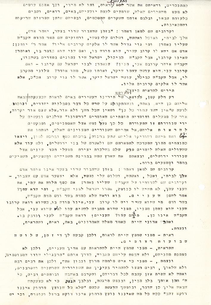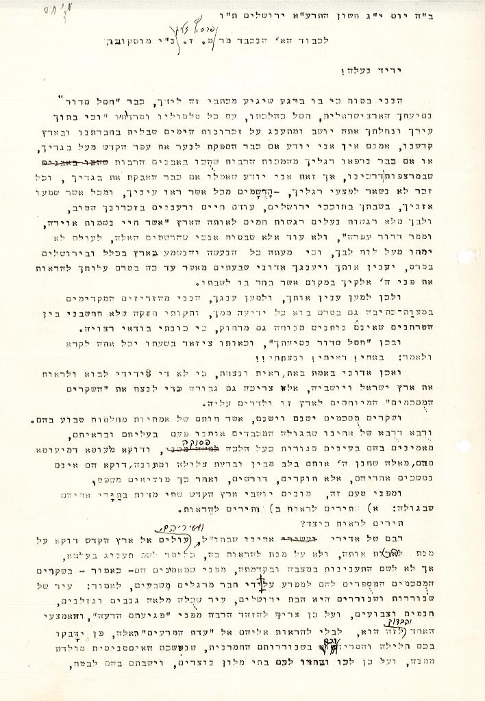 "...אמנם אין אני יודע אם כבר הספקת לנער את עפר הקדש מעל בגדיך, או אם כבר נרפאו רגליך מהמכות הרבות שהֻכו באבנים הרבות שבמרצפות דרכינו, אך זאת אני יודע שאפילו אם כבר האבקת את בגדיך, וכל זכר לא נשאר לפצעי רגליך, - הרשמים מכל אשר ראו עיניך, ומכל אשר שמעו אזניך, בשבתך בתוככי ירושלים, עודם חיים ורעננים בזכרונך הטוב, ולבך מלא רגשות נעלים רגשות חמים לאותה הארץ ..."