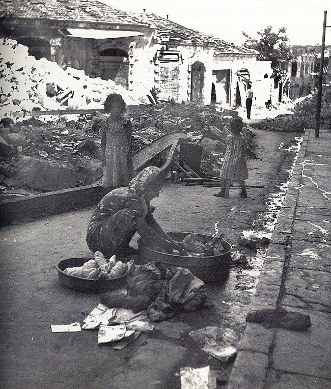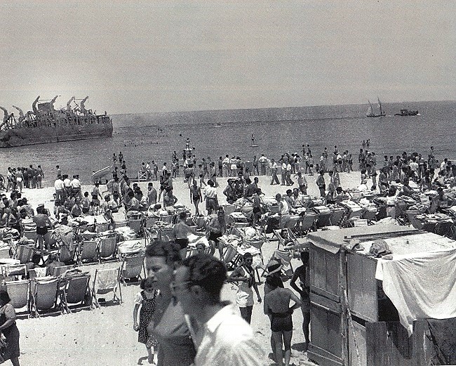 מתרחצים רוחצים לחופה של תל אביב אל מול האנייה "אלטלנה" הנטושה. תל אביב, 1949