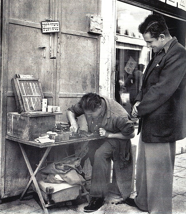 דוכן של מומחה לתיקון עטים נובעים ברחוב יפו, 1950