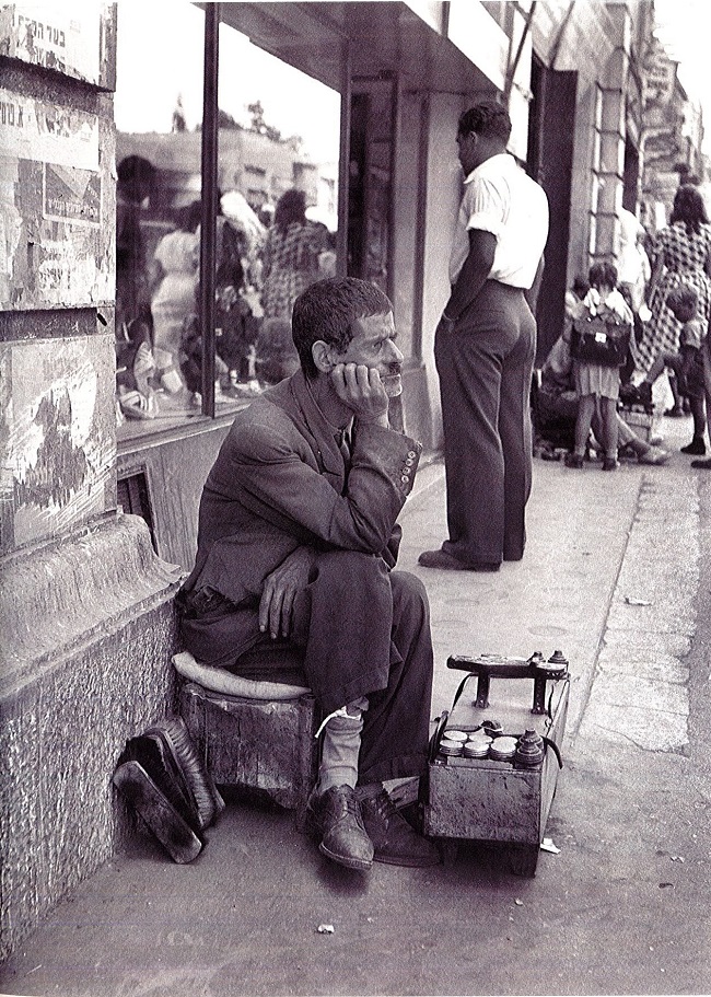 מצחצח נעליים מחכה ללקוחות, ירושלים, 1950