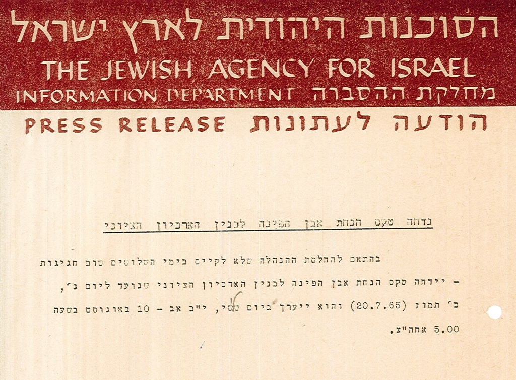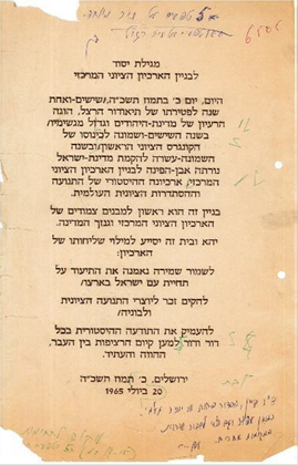 מגילת היסוד לטקס הקמת בניין הארכיון הציוני, 1965 (L33\1808)