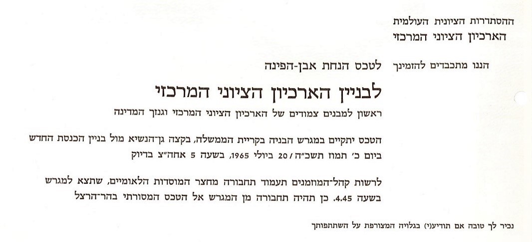 הזמנה לטקס הנחת אבן הפינה לארכיון הציוני, 1965 (L33\1808)