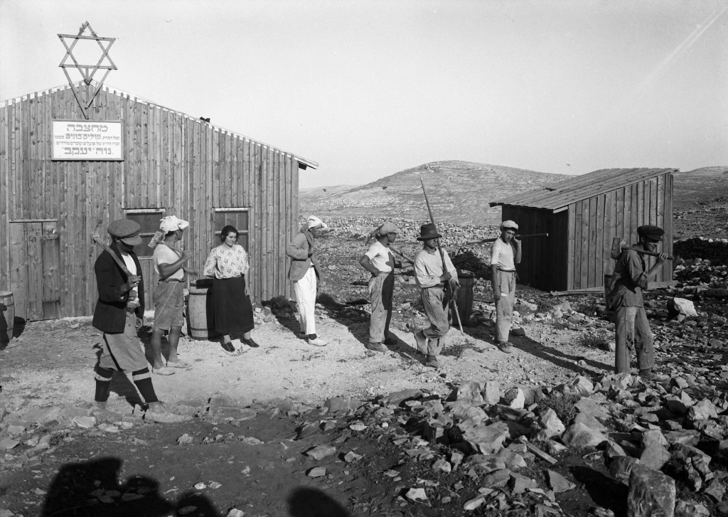 בתמונה מופיעה מחצבה של חברת "עולים בונים" בנווה יעקב, ירושלים, בשנת 1919. זהו תצלום של צדוק בסן עם כמה אלמנטים יפים: עולים עם כובעי קסקט, יהודים העובדים בעבודת כפיים קשה, חלוצים על רקע הגבעות החשופות, מגן דוד בראש מבנה המחצבה וצלם יחיד ומיוחד – צדוק בסן. (GNZB\401789)