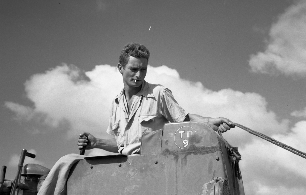 תמונה של עולה מהונגריה בבאר טוביה עובד בחקלאות, המפעיל את הטרקטור במיומנות תוך כדי עישון סיגריה. הצלם, יוסף שווייג, צילם אותו בזווית מפתיעה על רקע השמיים הבהירים, פרפרזה על גיבורי המערבונים. התמונה מסוף שנות ה-40 ונמצאת באוסף קרן היסוד. (NKH\401480)