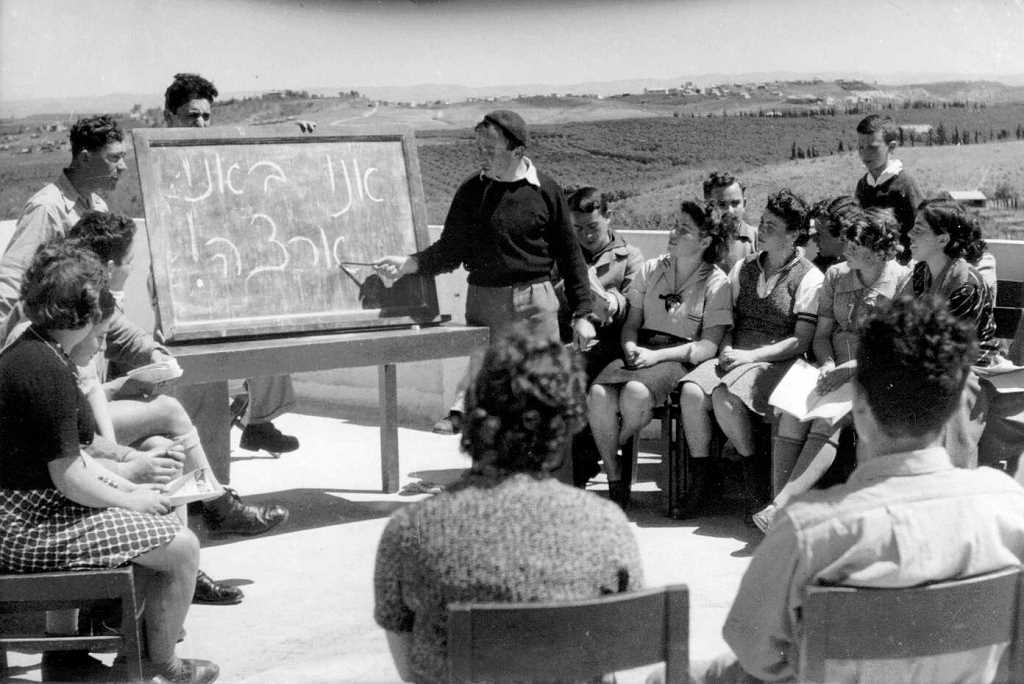התמונה השנייה שנבחרה מתעדת גם היא את ילדי טהרן לאחר הגעתם לבית הספר החקלאי בעינות. התמונה צולמה בעיצומו של שיעור עברית, שהתרחש על רקע הגבעות המוריקות בשנת 1943. על הלוח כתוב המשפט הנחוש: "אנו באנו ארצה!" (PHG\1006093)