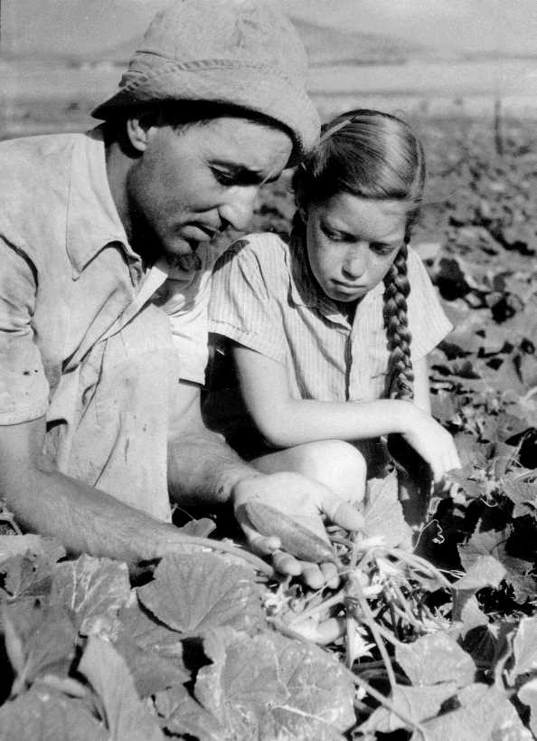 בתמונה רואים ילדה מתוקה עם צמות ארוכות, הלומדת ברצינות רבה על גידול מלפפונים. הצלם זולטן קלוגר העביר בצילומו את החשיבות, שהעניקו ביישוב היהודי לחינוך הילדים לעבודה חקלאית בארץ ישראל. שנת 1947, תצלום מאוסף קרן היסוד. (PHKH\1291119)