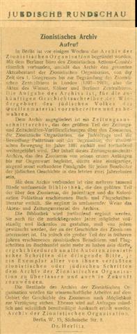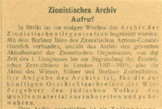- 1919: ארתור הנטקה, חבר ההנהלה הציונית, מציע להיסטוריון גיאורג הרליץ לקבל על עצמו את תפקיד הארכיונאי במשרד ההנהלה הציונית, ששכן באותם ימים בברלין. הרליץ, שהיה בעל ניסיון בעבודה ארכיונית, קיבל את ההצעה, והתחיל בהקמת "ארכיון ציוני".