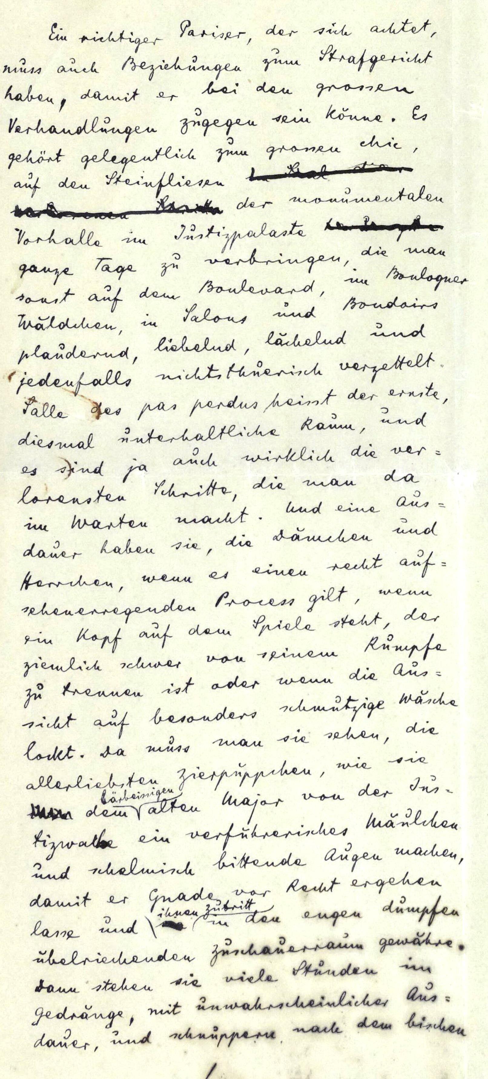 פריזאי אמיתי שחושב את עצמו כאדם בעל ערך, שומר על קשר טוב עם בית הדין, על מנת שיותר לו להיכנס לדיונים. זה נחשב ל"צו השעה" לבלות את רוב היום באולם הכניסה של בית הדין, במקום בשיחות חולין בשדרות, בסלונים, ובבתי הקפה. הנשים והגברים הצעירים ממתינים בנחישות, בחדר ההמתנה, על המדרגות הריקות, עד שתותר להם הכניסה לדיונים הסנסציוניים. ובמיוחד הדברים אמורים לגבי משפט שחורץ את גורלו של אדם, או שבו מכבסים את הכבסים המלוכלכים בפרהסיה. עליכם לראות את האופן בו הנערות המתוקות לוטשות את עיניהן, מפלרטטות ומצטעצעות, על מנת ששומר הסף המזוקן יחמול עליהן ויתיר להן להיכנס אל החלל המעופש. שם הן יחכו במשך שעות לסקנדל או להתרגשות של דרמת בית המשפט. זה תמיד משעשע, כאשר הדבר נוגע לכבוד, לחופש, או לראשו של אדם. ישנו ניגוד מגוחך בין הטקסים המדודים, וההתבדחויות של הקהל. תמיד ישנם לצים בין הצופים. כל חלופת דברים בין השופט לעורכי הדין הופכת לנושא לבדיחות, וכל תקרית לחידוד לשון. כאשר 12 הצרפתים היושבים על ספסל המושבעים פורשים סוף סוף לחדרם לשם היוועצות, הרעב והצמא נשכחים. כל מה שניתן לעשות הוא להמתין במתח נפלא לגזר הדין.
