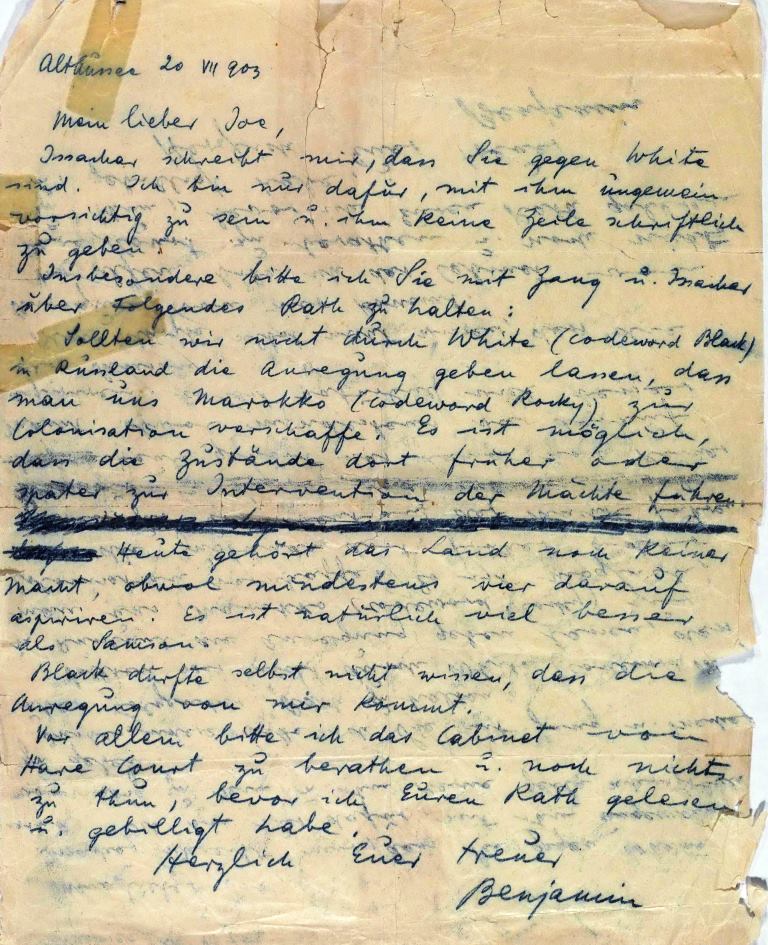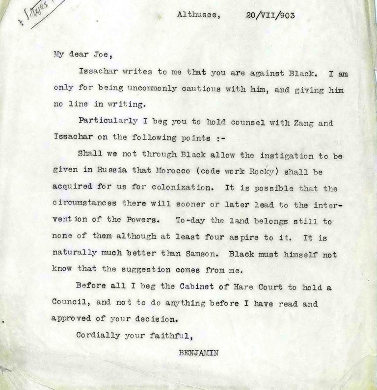 "האם לא כדאי לנו לתת לארנולד וויט (שם קוד בלאק) להציע לרוסיה לתת לנו את מרוקו (שם קוד רוקי) להתיישבות בה? התנאים שם יובילו, במוקדם או במאוחר, להתערבות המעצמות. היום, הארץ לא שייכת עדיין לשום מעצמה, אך ארבע שואפות לשלוט בה. כמובן שזו אופציה טובה יותר משמשון (מזרח אפריקה). על בלאק לא לדעת בשום אופן כי ההצעה הגיעה ממני".