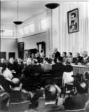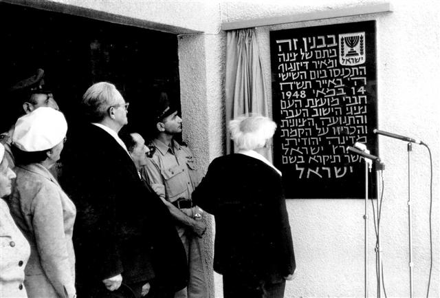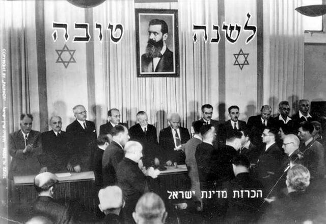 "דוד בן-גוריון מכריז על הקמת מדינת ישראל. מדינות ערב מאיימות בפלישה. ארצות הברית מכירה במדינה החדשה". (נאור, מרדכי. הציונות. מאה השנים הראשונות. מבואות, תאריכון, תעודות ומושגים. הוצאת הספריה הציונית על ידי ההסתדרות הציונית העולמית, 1997, עמ' 95)