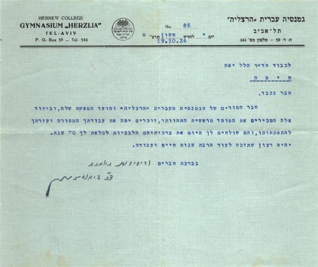 מכתבי ברכה אלה ועשרות נוספים נשלחו אל ד"ר הלל יפה לרגל חגיגת יובל ה-70 שלו. המכתבים מבטאים הערכה והכרת תודה של אנשי היישוב היהודי בארץ על עבודתו המסורה "כרופא חלוץ כעסקן וכאזרח גדול" ("ד"ר הלל יפה", דבר, 19.1.1936, עמ' 1).