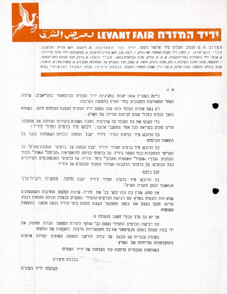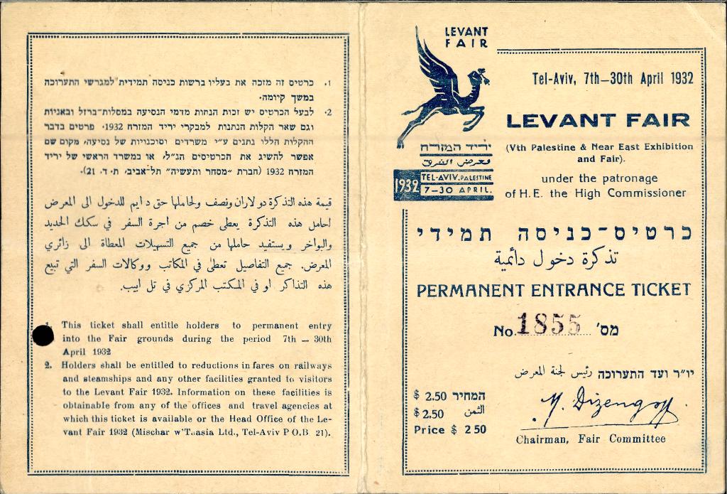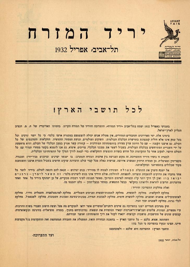 בתל אביב נפתח "יריד המזרח" הראשון – יריד מסחרי בינלאומי בהשתתפות מציגים מ- 24 ארצות שונות. ליריד זה קדמו שורה של תערוכות ושל ירידים תל אביביים החל משנת 1923. בשנת 1932 הוחלט לקרוא ליריד "יריד המזרח", ועוצב לו סמל מיוחד על ידי אריה אלחנני: גמל מעופף, שסימל את הקשר בין מזרח למערב.