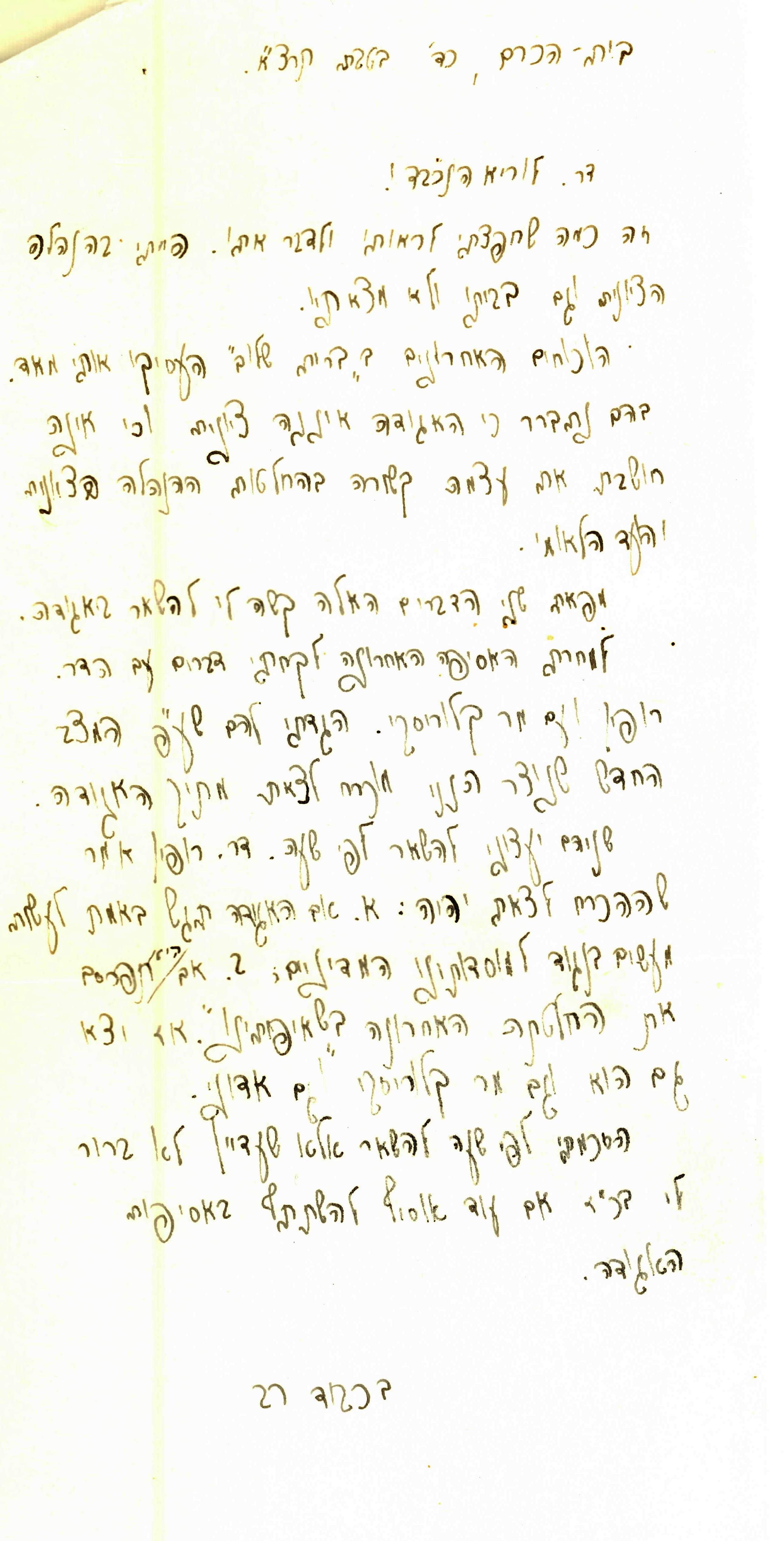 It seems that the collective Zionist memory has forgotten Rabbi Binyamin. Maybe the reason is his political outlook; maybe it is the complexity of his ideas and his unwillingness to conform to any one ideological category. The documents before you offer a small glimpse of the thinking of a man who believed that only peace and fraternity can guide Israel on the path to righteousness and justify its existence. As he wrote in “The Arab Burden”, “Great and deep are the ways of love. Its depths are yet to be delved into. Close it and it will never again open. Open it and no force could ever close it again.”