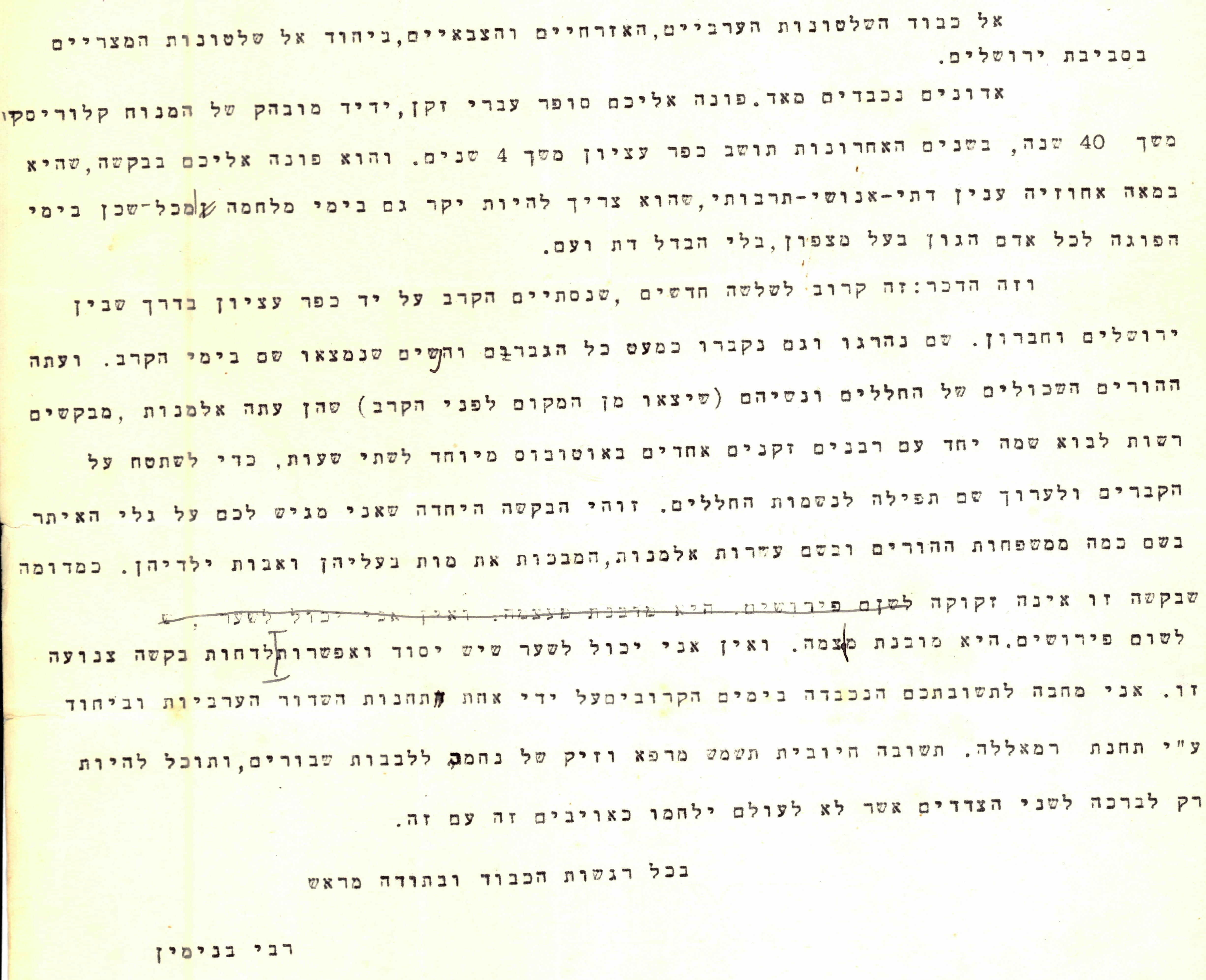 An apeal to the Arab leadership, where R' Binyamin asks that the Jews be let into Jordanian contrloed Gush Etzion to visit graves of their loved ones that fell during the 1948 war.