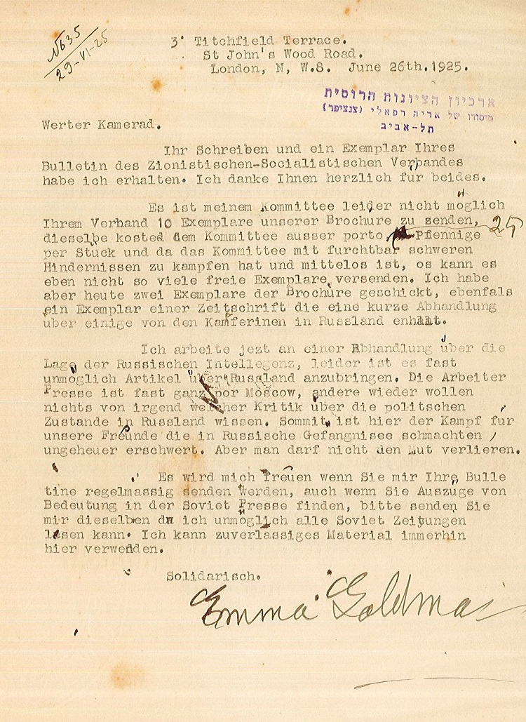 comrade in the Social Zionist Party, June 1925 (F30/59). The letter, kept in the files