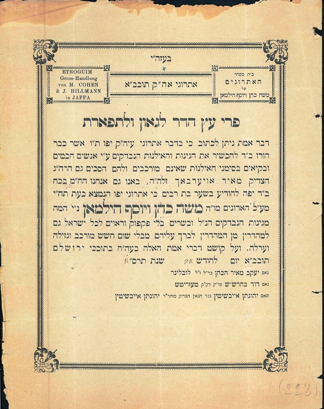 Kashrut certificare for citrons from Moshe Cohen & Joseph Hillman Trading House in Jaffa, 1901 (A25\113)