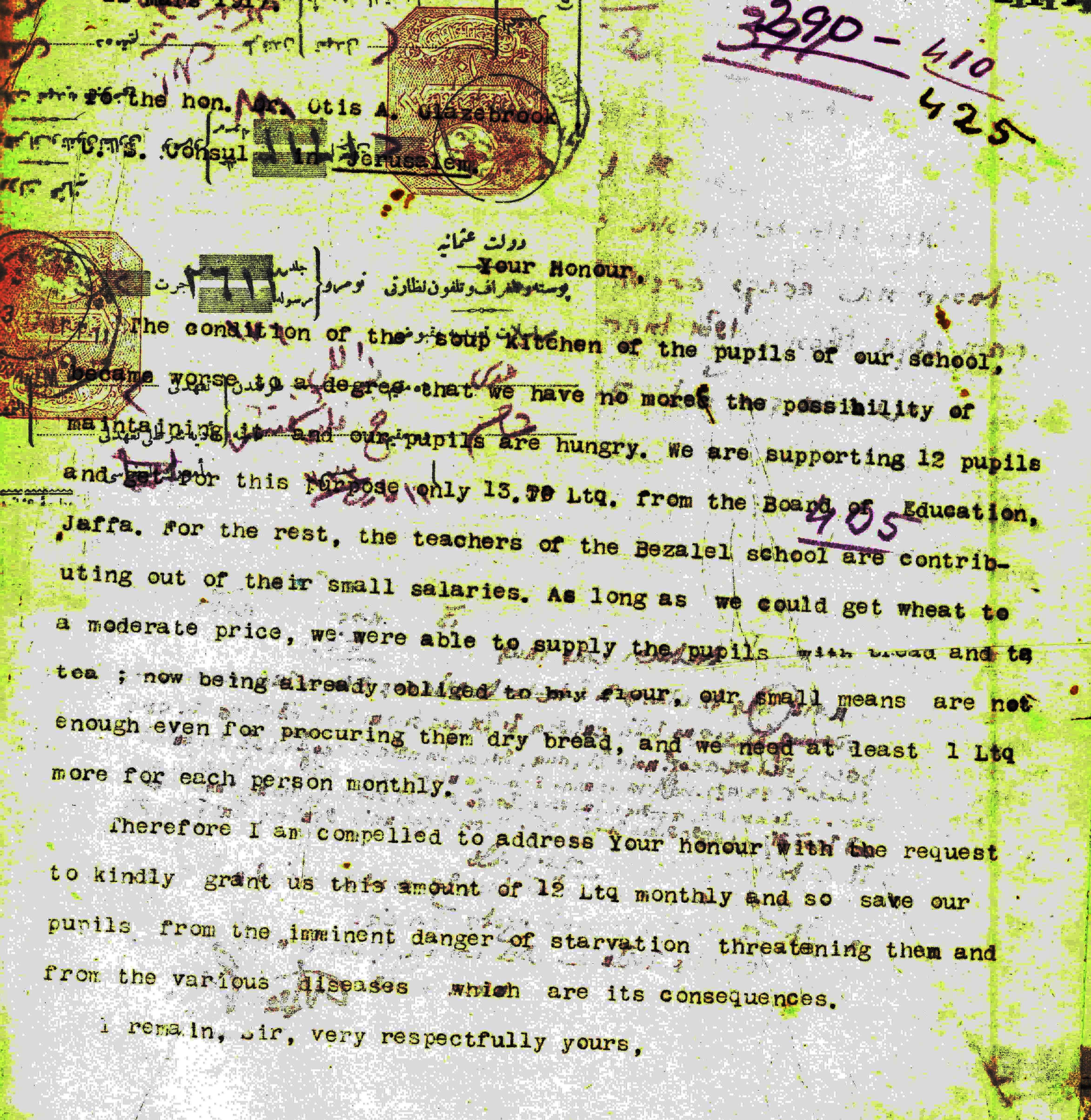 The first years of the school knew many ups and downs. The house on Shmuel Hanagid street, with its beautiful garden and the bustling creativity of its inhabitants, was a cultural center. It housed exhibitions, lectures and shows that were open to the public. But these were also hard times, as the letter before you shows. In the letter, from 1917, Schatz pleads the American consul in Jerusalem to aid the school, because the students are on the brink of starvation.