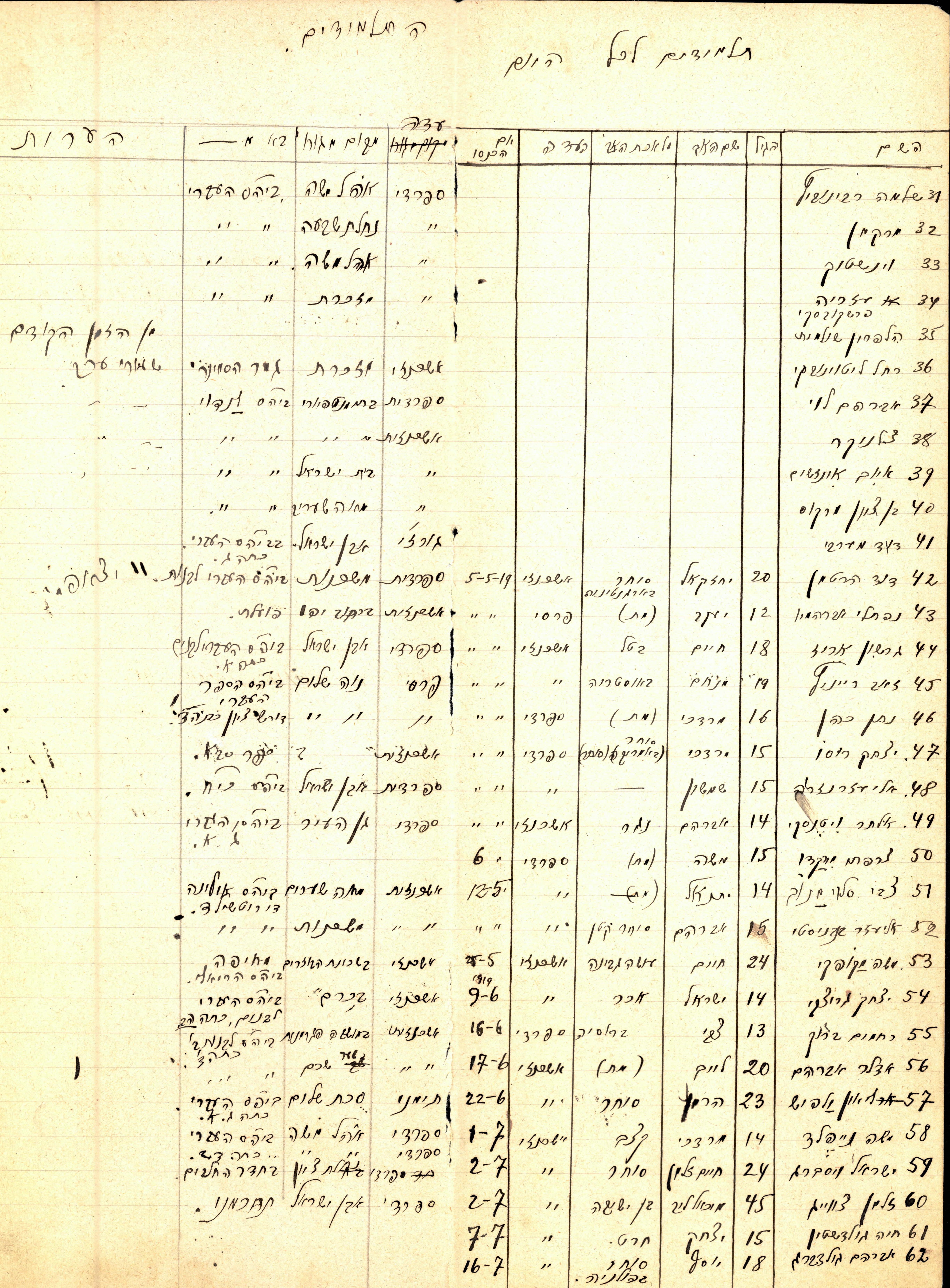 Student list, listing, among other things, the students' communal affiliation: