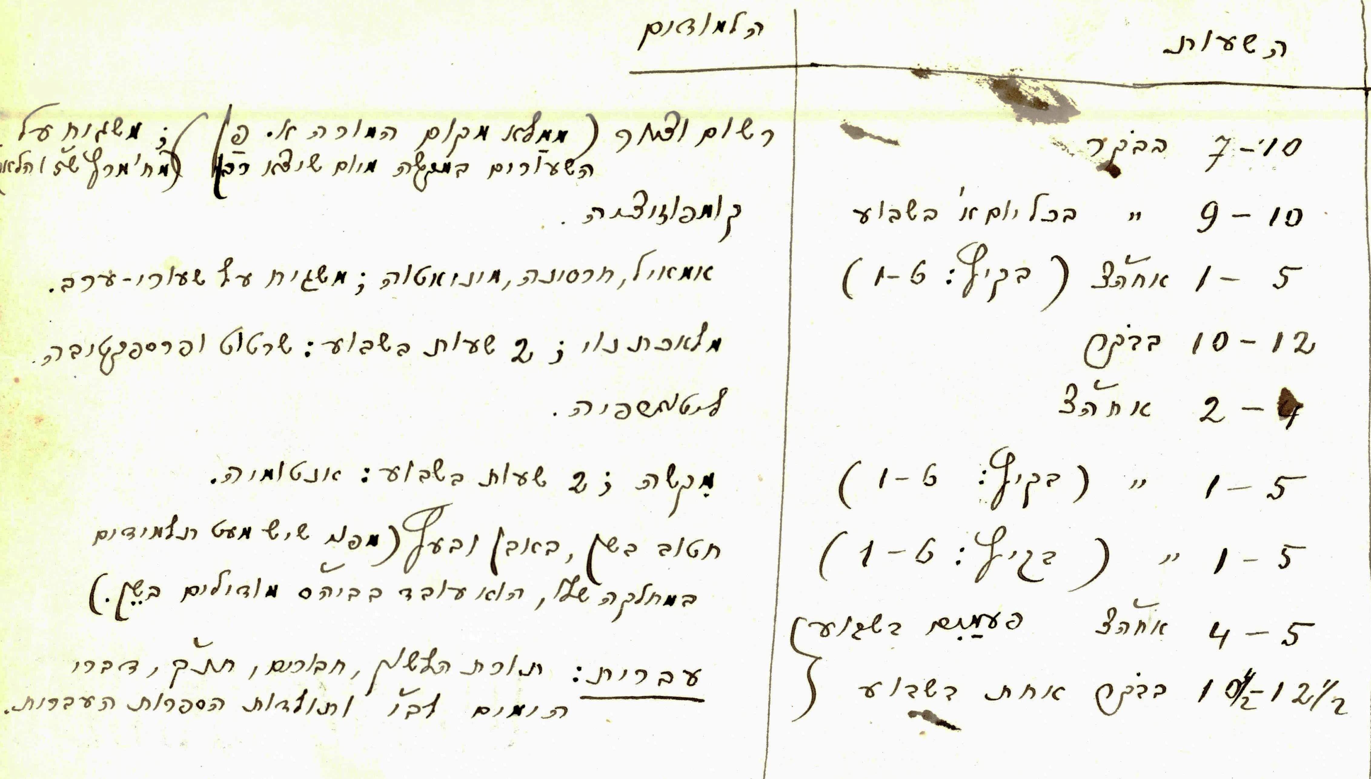 An academic timetable. Among various art courses, the students also took bible studies and Hebrew literature: