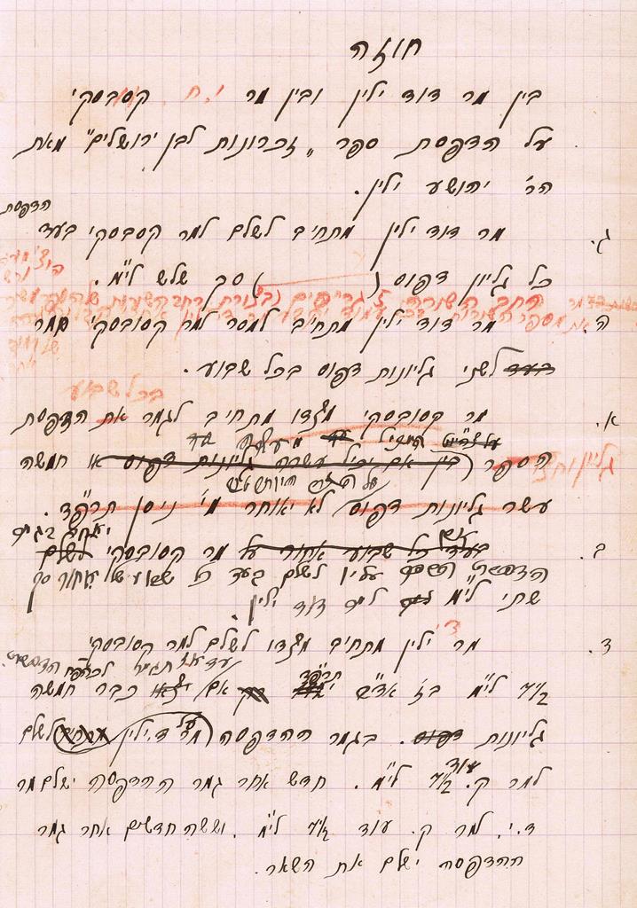 The contract signed beween David Yellin, Yehosha's son, and the book's publisher. the book was published in 1924 (A200\9)