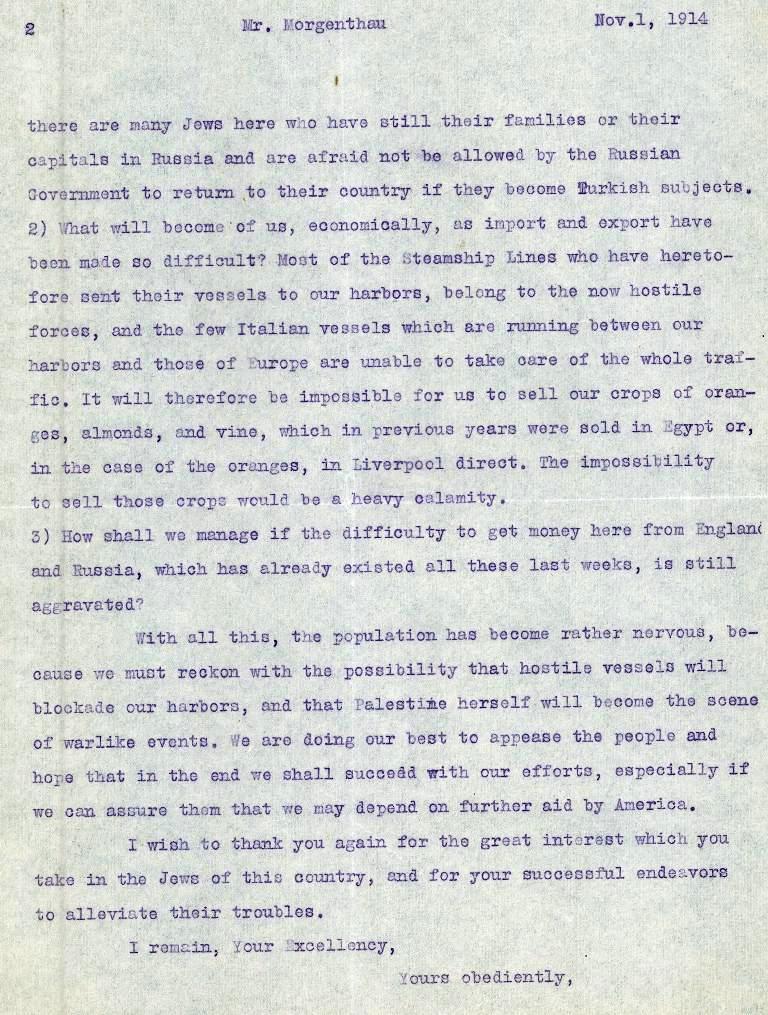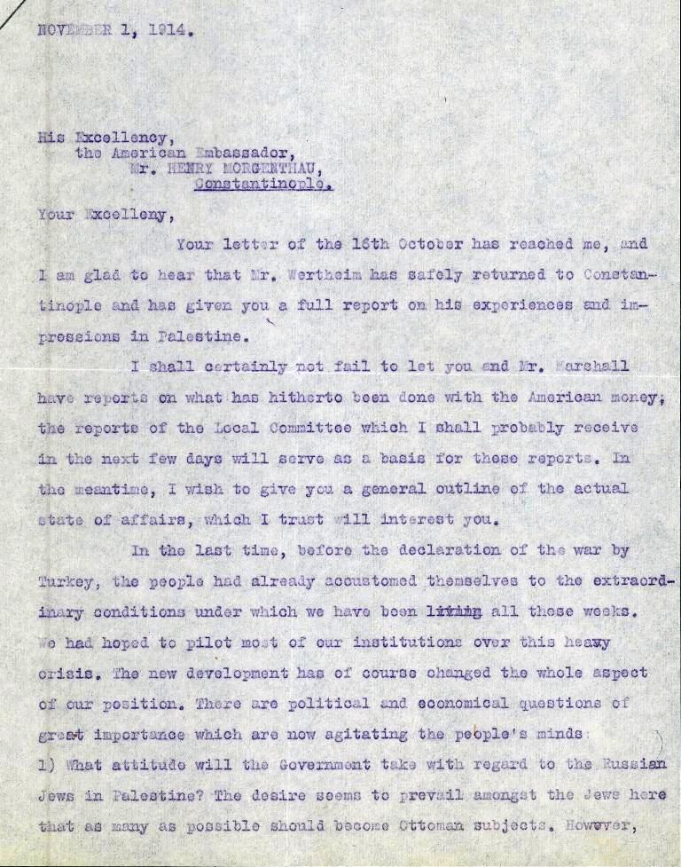 The letter below was sent from the Central Zionist Office to Henry Morgenthau, the American ambassador to the Ottoman Empire, in November 2014 – just after the Ottoman Empire had entered the war. This intriguing letter outlines the main concerns of the Jews in Palestine in light of the new situation they had entered: