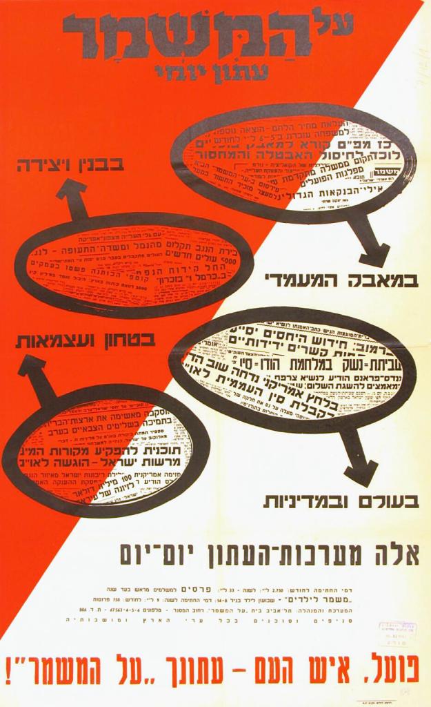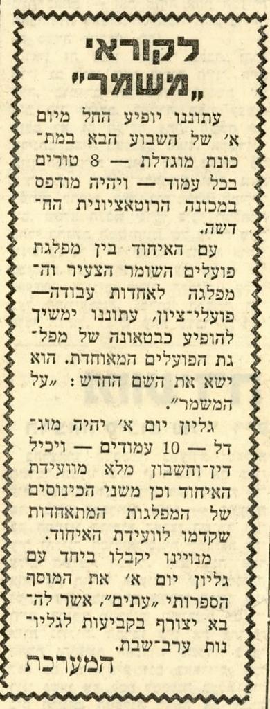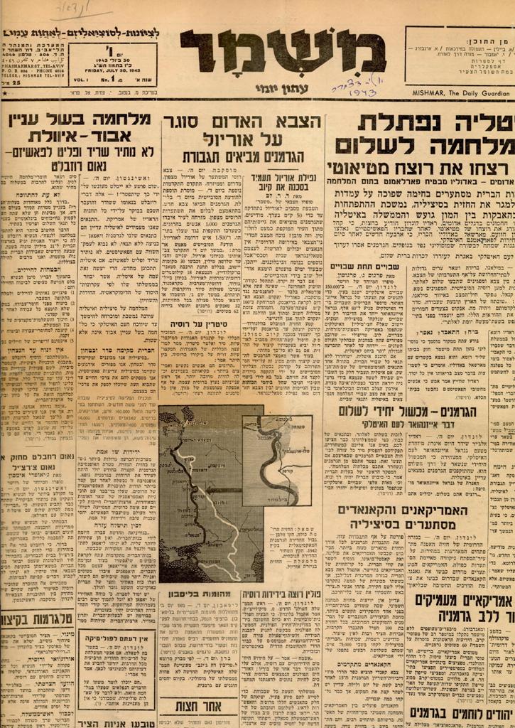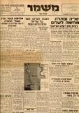 The newspaper “HaMishmar” was first published in July 1943 in Tel Aviv. It was founded by the “HaShomer HaZa’ir” movement, whose members were dissatisfied with the workers' first newspaper, “Davar”. The banner of the front page of every issue presented the motto of the movement: “For Zionism, socialism and the brotherhood of nations”. Its readership was mainly based on subscriptions from the members the kibbutzim of the “Kibbutz HaArtzi Hashomer HaZa’ir” and members of Mapam (the United Workers Party). The first editors of the newspaper were Mordechai Bentov, Yaakov Amit and Eliezer Peri. The literary supplement was edited by Avraham Shlonsky.