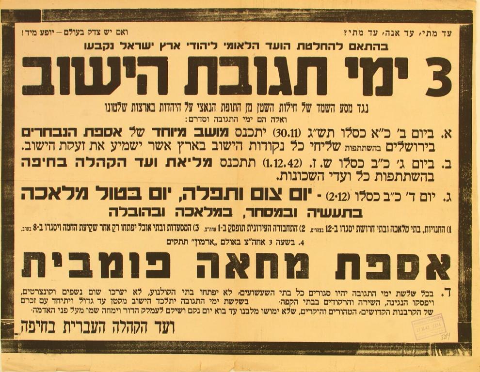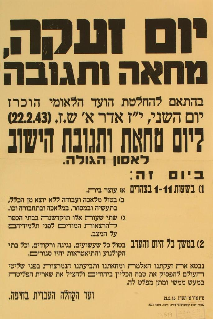 "In Eretz Israel the first reliable news regarding the horrifying extent of the Jewish Holocaust in Europe is published. Institutions of the Yishuv declare three days of mourning". (Naor, Zionism: Timeline, Articles, Documents, Glossary. The Zionist Library, The Publishing House of the World Zionist Organization, 2002, p. 122).