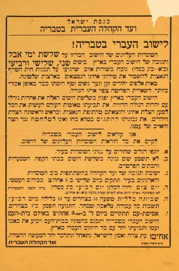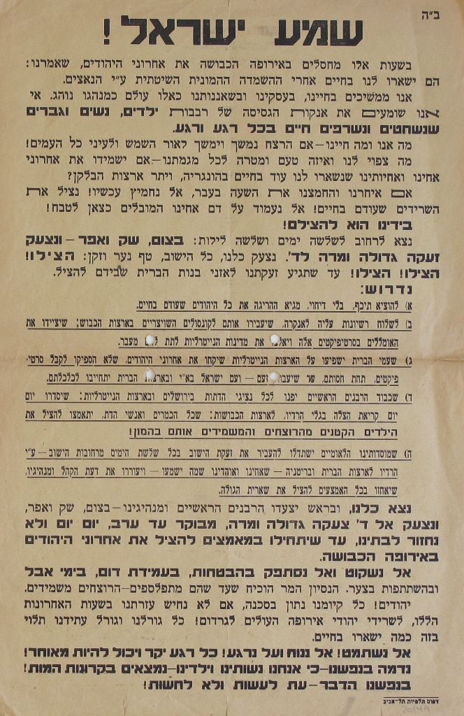 The handbills below express the reaction of the Yishuv to the events in Europe after receiving the news of the Holocaust from different sources. These news were mentioned in correspondence between different people and institutions – like the presidency of the Rescue Committee, that were published in local newspapers, also kept in The Archives.