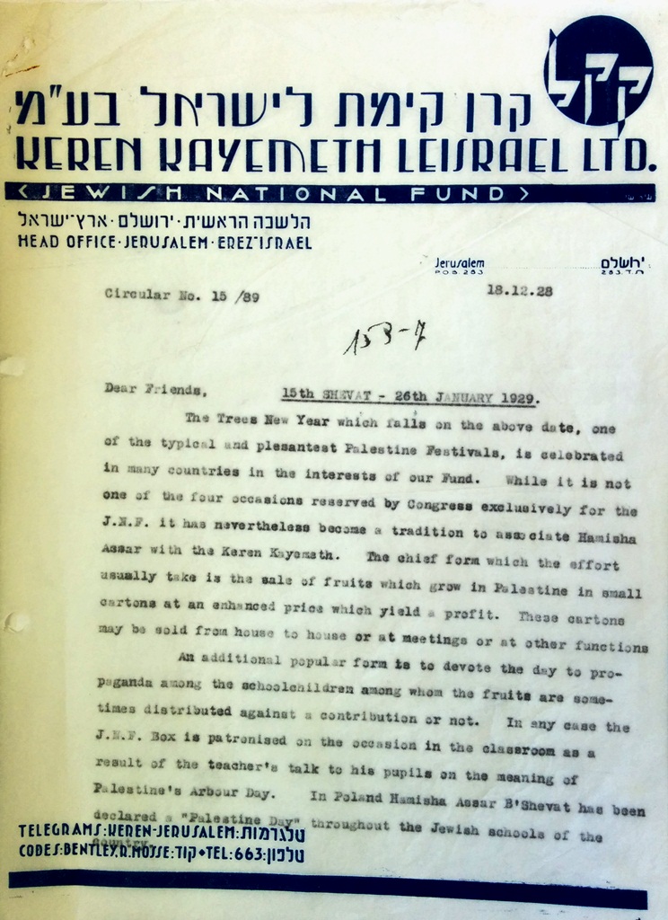 While tree planting on Tu Bishvat became a custom in Palestine, in overseas communities the Jewish National Fund (JNF) used the date for propaganda and fund raising. The Head Office of the JNF in Jerusalem sent a letter to the other offices on 1928 with a description of the activities planned for Tu Bishvat. Volunteers went from house to house in the Jewish communities and sold boxes of fruits from Palestine. The Jewish schools dedicated the day to Palestine, and the Blue Box was placed in the classroom for donations. That year the JNF also prepared a set of photographs for display, and a movie about Tu Bishvat, and sent articles to the Jewish press with information about the forests that were planted during the previous year.
