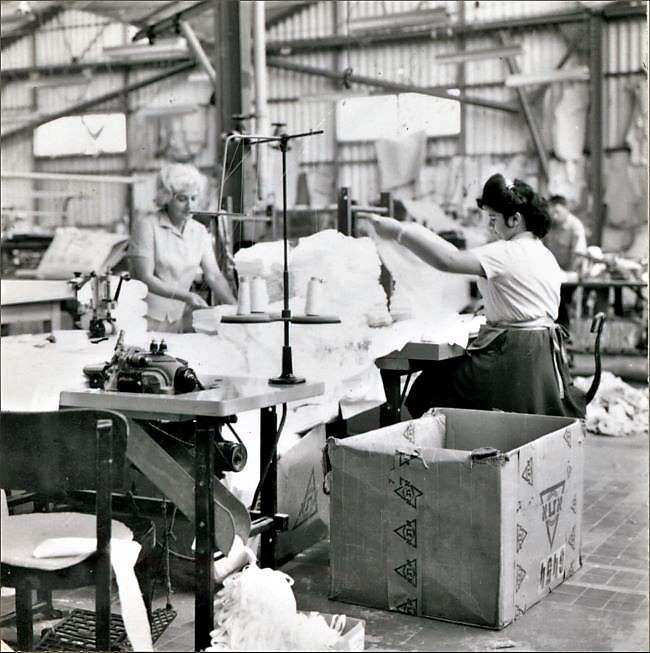 תופרות ליד ערימות בגדים בתוך בית החרושת "אתא", צילום נוסף של