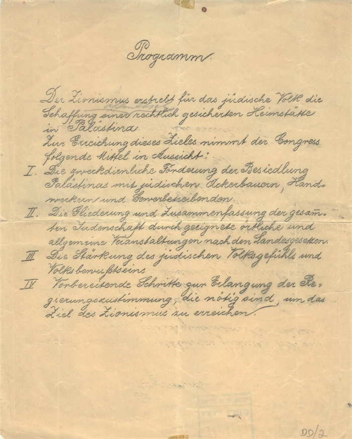 ביום ראשון, ה-29 באוגוסט 1897, התכנסו יותר מ- 200 צירים מקרב הקהילות היהודיות לשלושת ימי הקונגרס הציוני העולמי הראשון, והתנועה הציונית החלה את דרכה כגוף מאורגן וממוסד. נוסח הצעת "התוכנית הציונית", שהונח על שולחן הקונגרס על ידי מקס נורדאו ביומו השני של הקונגרס, נכתב בכתב יד ושוכפל להפצה בקרב צירי הקונגרס. התוכנית כללה ארבעה סעיפים שהועמדו להצבעה בקרב הצירים, ולאחר אישורם (בתוספת מילה אחת) נחשבו למסמך הייסוד של התנועה הציונית המכונה "תוכנית באזל".