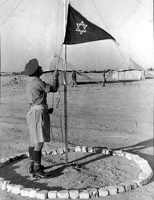 חייל מניף את דגל הבריגאדה היהודית, 1945. צילום: טים גידל, אוסף קרן היסוד (PHKH\1289765)