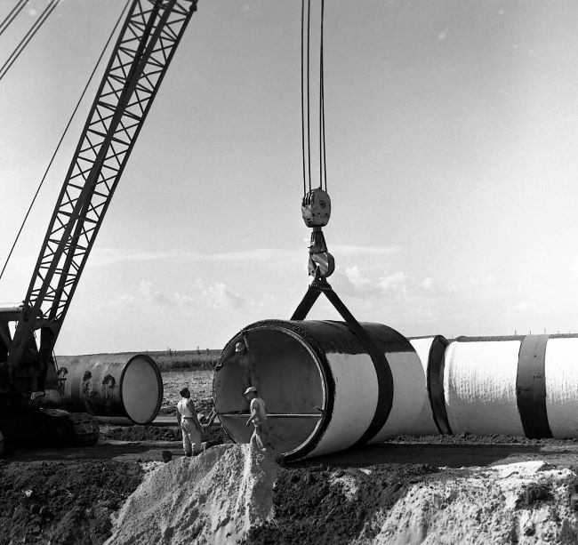 תמונה נוספת של חנן שדה מפרויקט "המוביל הארצי": שלב הכנת קטעי הצינור הראשי לקראת ההרכבה והחיבור ביניהם. הקו הוביל מים ממנהרת מנשה עד לתחנת הוויסות ליד ראש העין – תחנת "נווה ירק" (NCHS\493924)