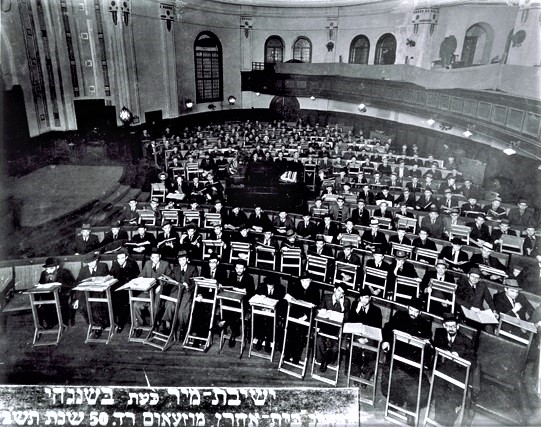 ישיבת "מיר" בבית הכנסת "בית אהרן" בשנחאי, 1942. מתוך הערך ישיבת "מיר", ויקיפדיה.