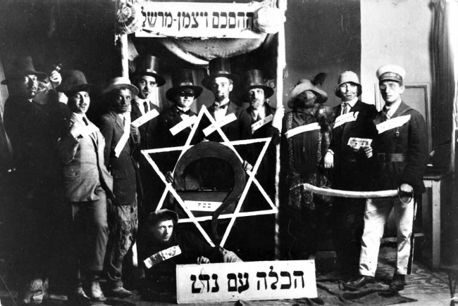 תחפושת סטירית של קבוצת צעירים מארץ ישראל על "הסכם ויצמן-מרשל": ויצמן ומרשל מוצגים כחתן וכלה, כשהכלה מביאה נדוניה ("נדן") נכבדת של מזוודות כסף לתנועה הציונית. מצד ימין עומדים המתנגדים ובידם חרב ארוכה ומצד שמאל התומכים ובידם כינור. (PHG\1025531)