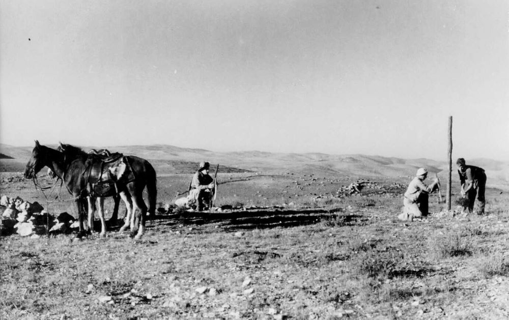 משגב עם, שהוקם סמוך לגבול עם לבנון, מסמנים במוטות את קו הגבול ביום העלייה על הקרקע, 1945. (PHG\1007295)