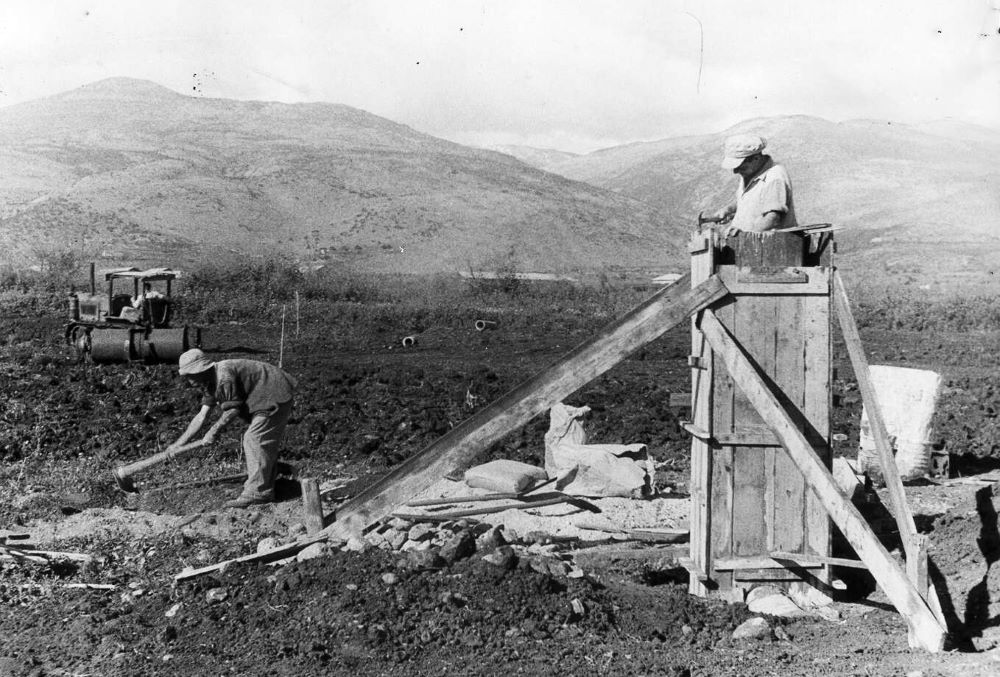 חברי הקיבוץ מסקלים את האדמה