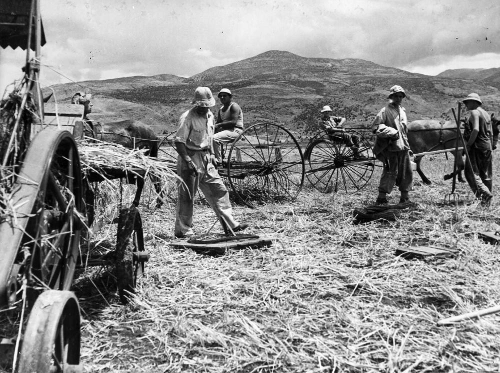 קציר החיטה ואיסופה בשדות קיבוץ דן, 1948. צלם: זולטאן קלוגר, אוסף קרן היסוד (PHKH\1262317)