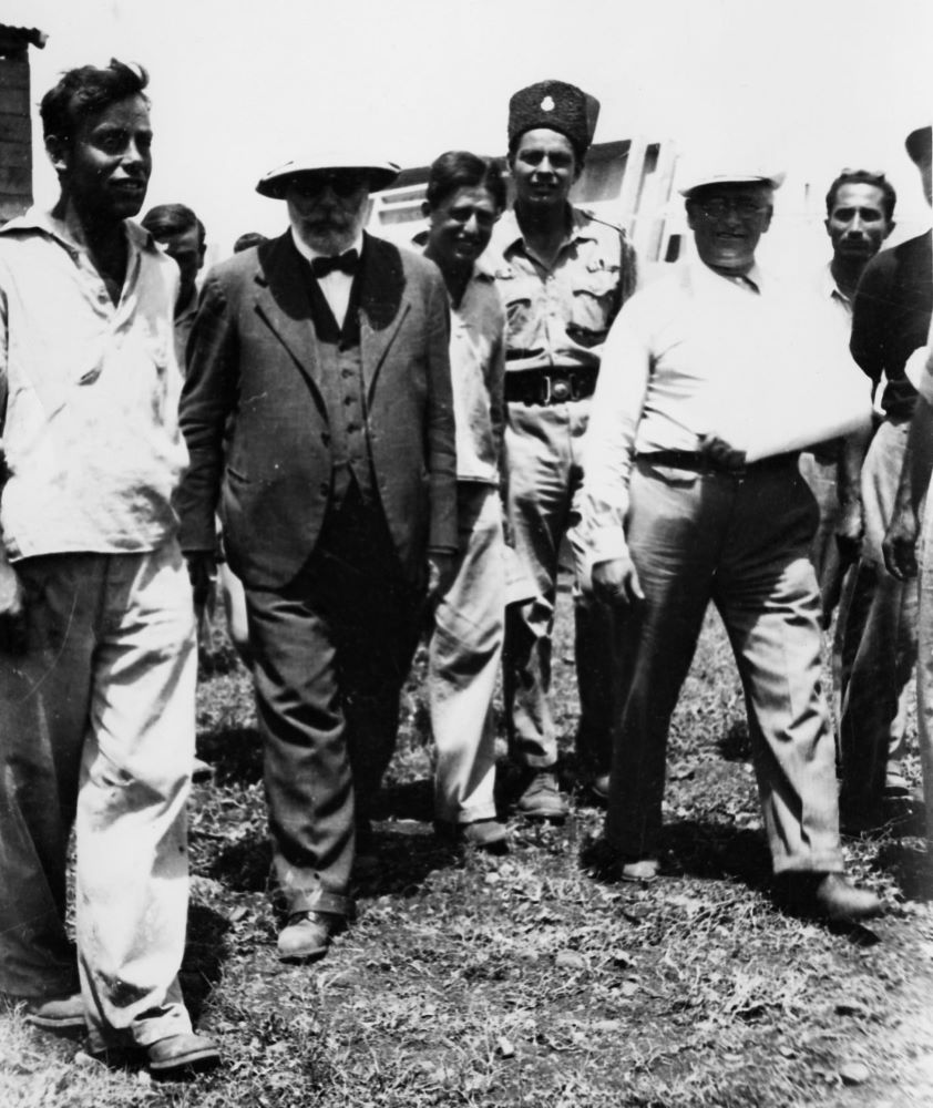 מנחם אוסישקין בביקור בקיבוץ דן סמוך להקמתו, 1939. מתוך אלבום שי שניתן ליוסף ויץ מחברי קיבוץ דן (PHYW\685394)