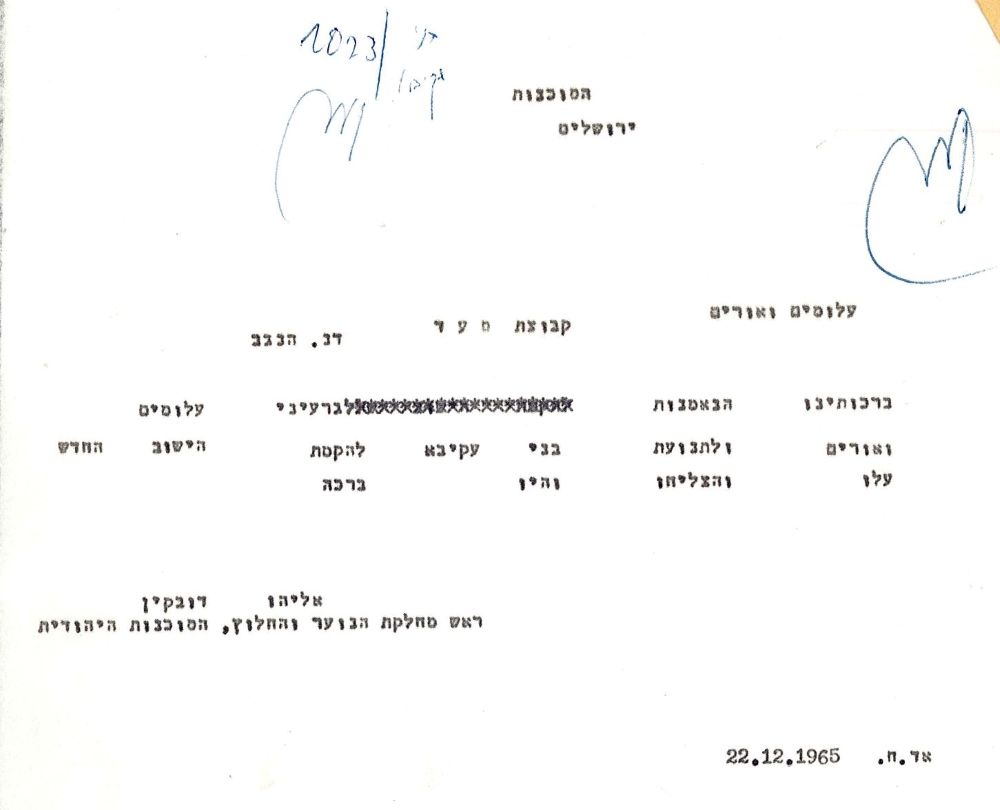 מברק הברכה, ששלח אליהו דובקין מהסוכנות היהודית לקבוצות עלומים ואורים ולקיבוץ סעד