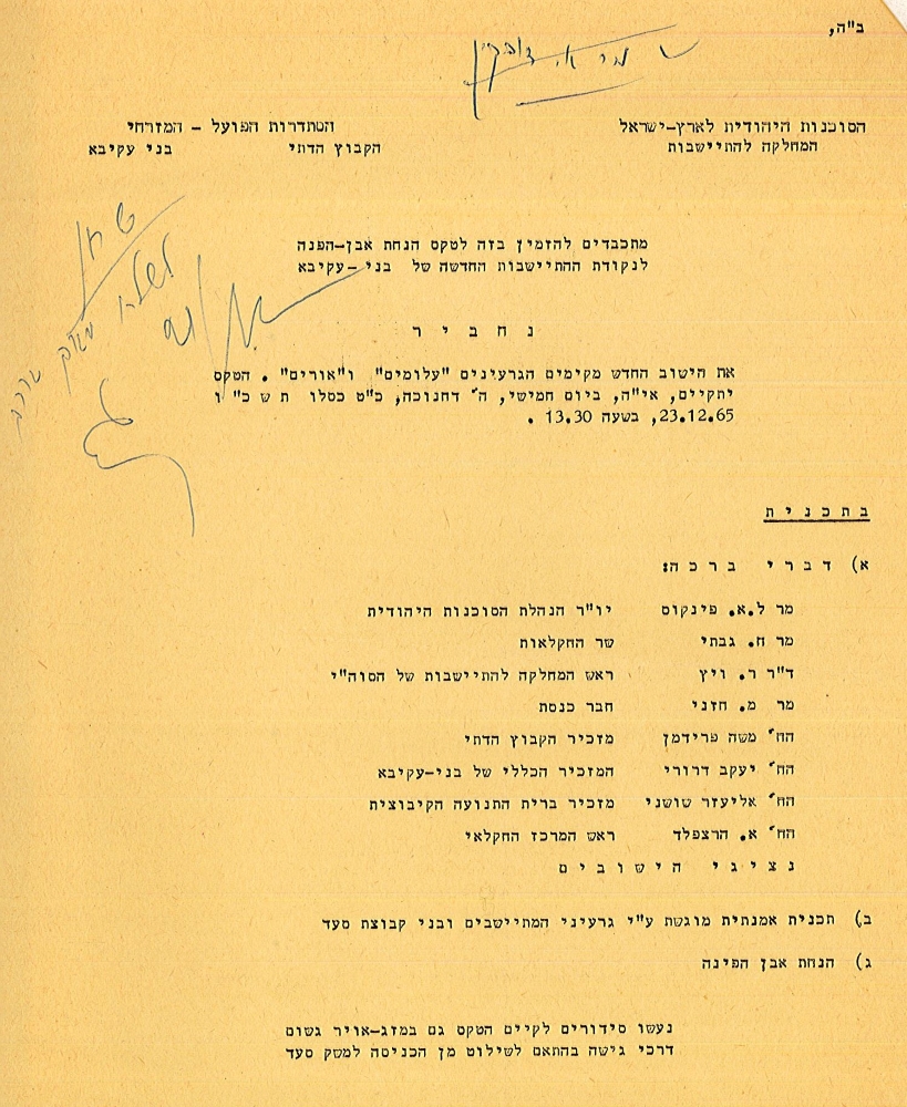 תרבות וחינוך דתיים באזורם מבלי לנסוע ליישובים מרוחקים. ד"ר רענן ויץ, ראש המחלקה להתיישבות של הסוכנות, הסביר זאת לכתב "הארץ" בטקס הנחת אבן הפינה: