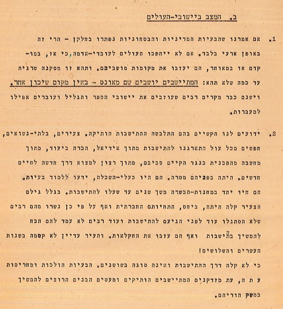 יושבים שם מאונס" מזכר סודי על המצב ביישובי העולים, מאת חיים בר אילן, יולי