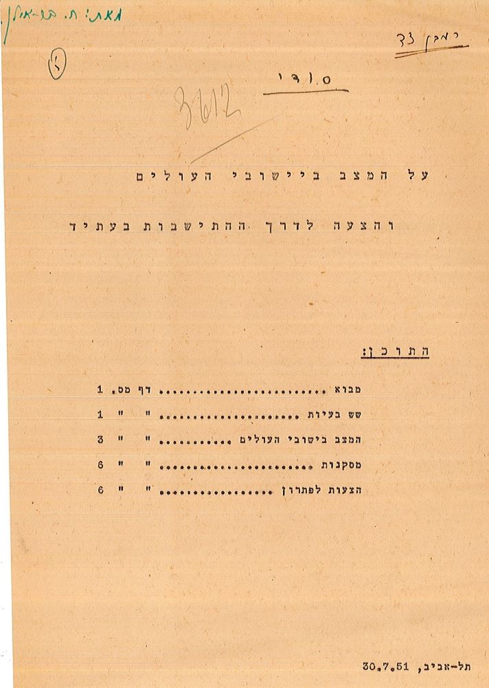 דו"ח סודי של מחלקת ההתיישבות על מושבי העולים מיולי 1951 מצייר