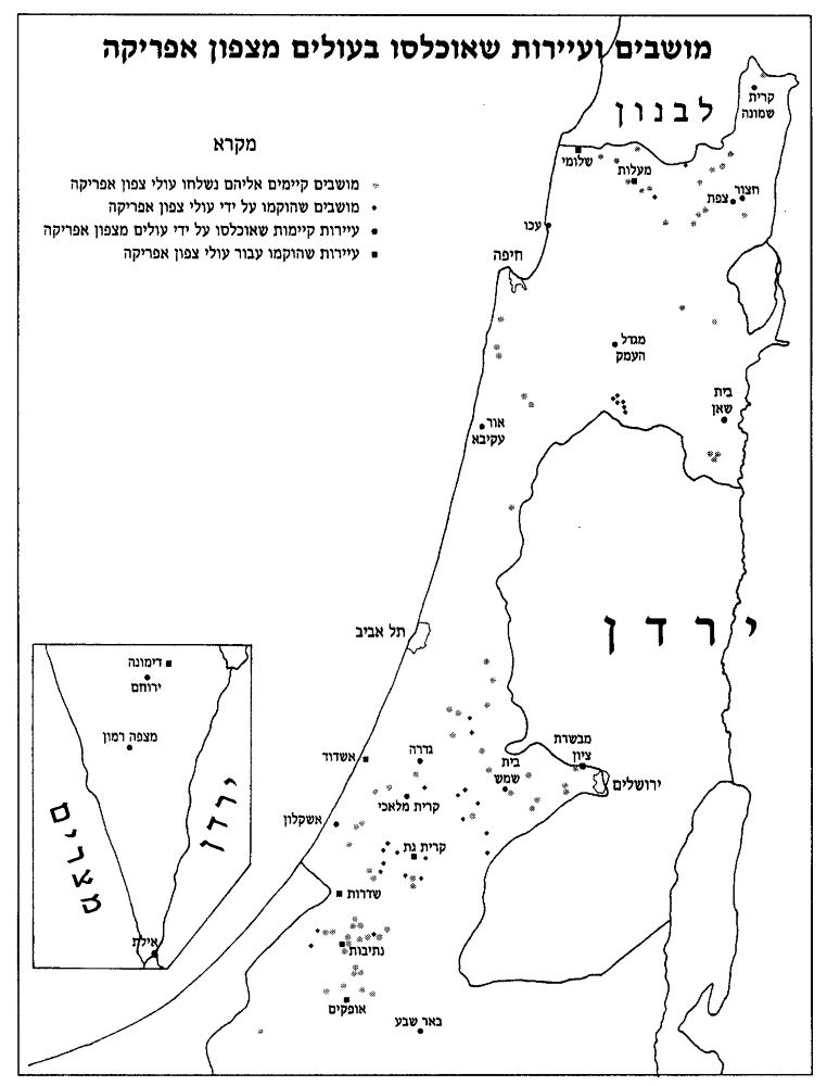 מפה המציגה מושבים ועיירות שאוכלסו בעולים מצפון אפריקה,