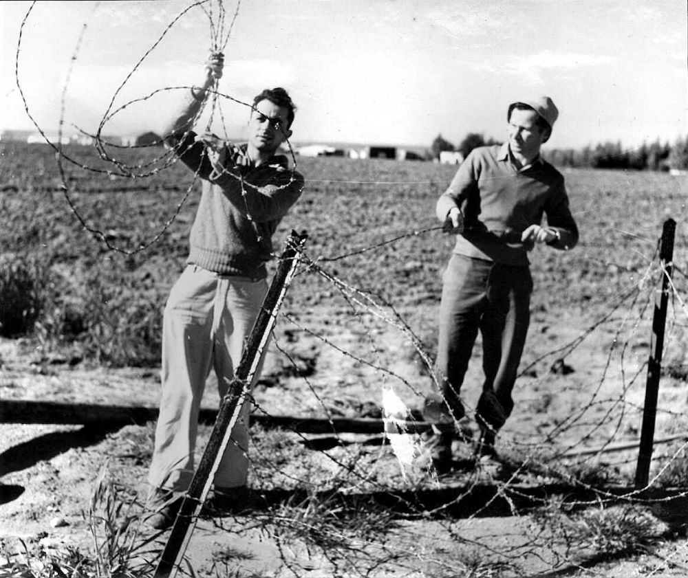גדרי תיל בקיבוץ נחל עוז על ידי מתנדבים מירושלים, ינואר 1956.