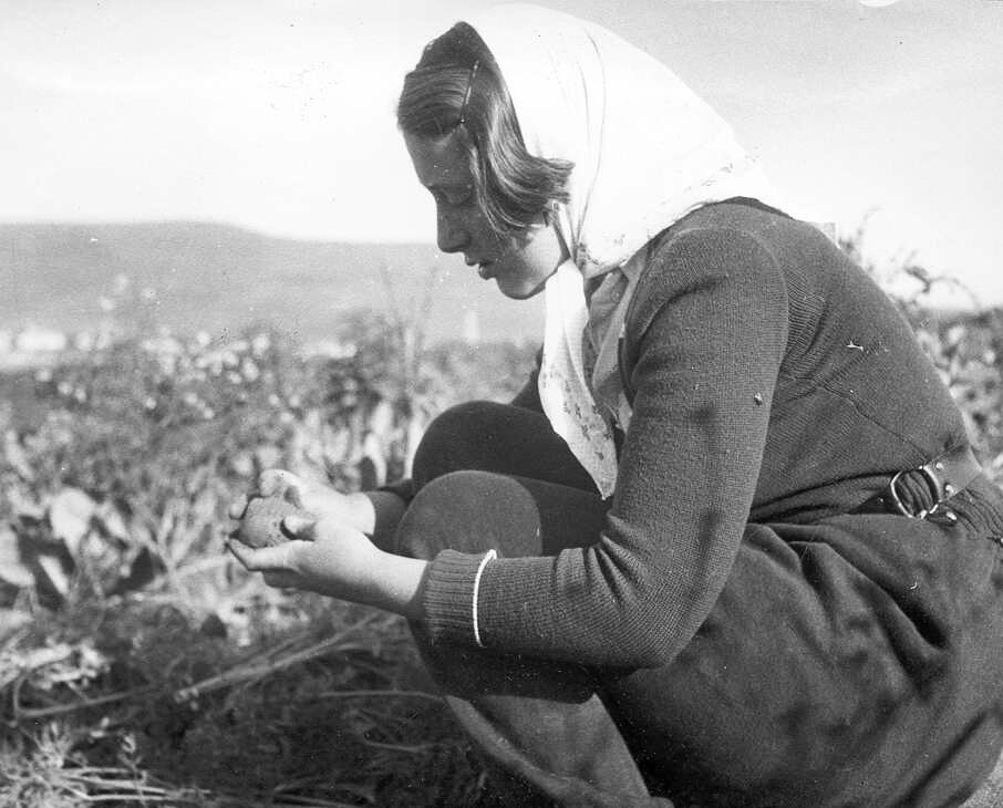 איסוף גזר ע"י נערה, שעלתה מגרמניה, דגניה, 1935. צלם: גל-עזר,